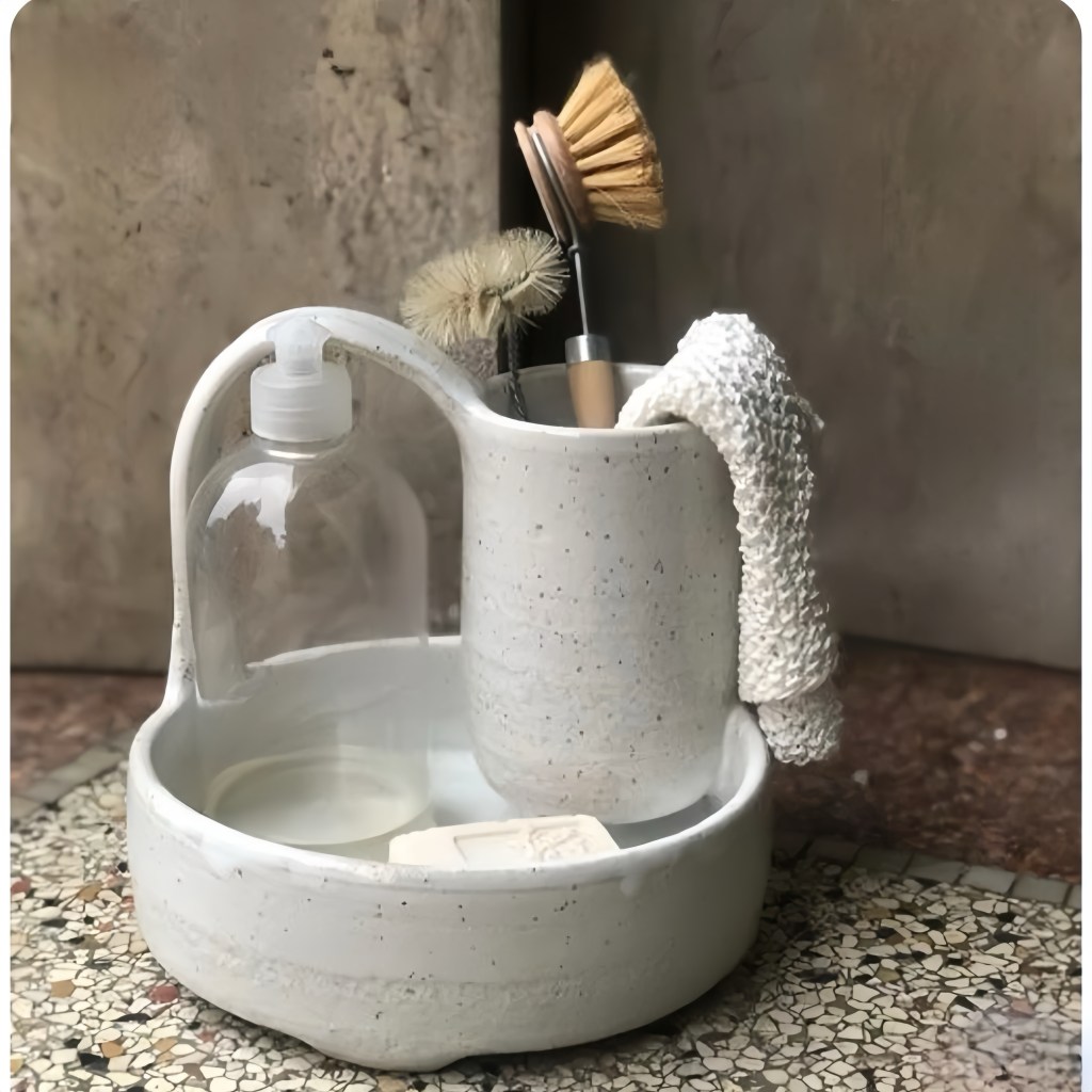 Made for an Australian kitchenware retailer. Multi-use ceramic set for brushes, bottles & soaps. Natural, rustic, and space-saving.